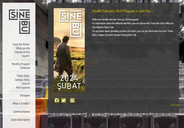 In addition to being the only public institution cinema in Turkey, SineBU is also the first cinema hall with an infrastructure suitable for access by disabled individuals. With its design suitable for the participation of individuals with orthopedic disabilities and its audio description infrastructure, it aims to enable individuals with visual and hearing problems to have an equal, independent and free cinema experience. To this end, it is one of the founding members of the Equal Access to Culture platform and carries out pioneering activities in the field.