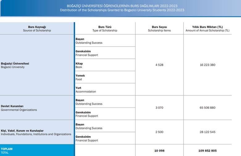 Boğaziçi University offers various scholarship and support programmes to prevent students from the bottom quintile or from families with economic needs from dropping out of their education due to financial difficulties, to strengthen equality of opportunity and to support successful students in achieving their academic goals. These scholarships are provided at undergraduate, graduate and doctoral levels and are based on academic achievement and need criteria.