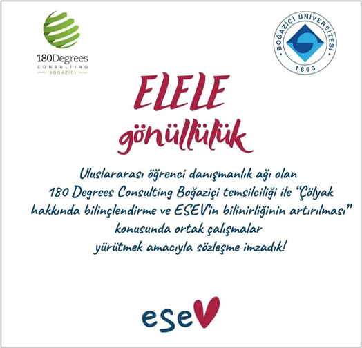 180 Degrees Consulting Boğaziçi, represented by Boğaziçi University, has collaborated with Elele Health Education and Solidarity Foundation (ESEV) to develop joint projects to raise awareness about celiac disease and increase awareness of the foundation. This cooperation contributes to NGOs' efforts to provide social benefit with university support.