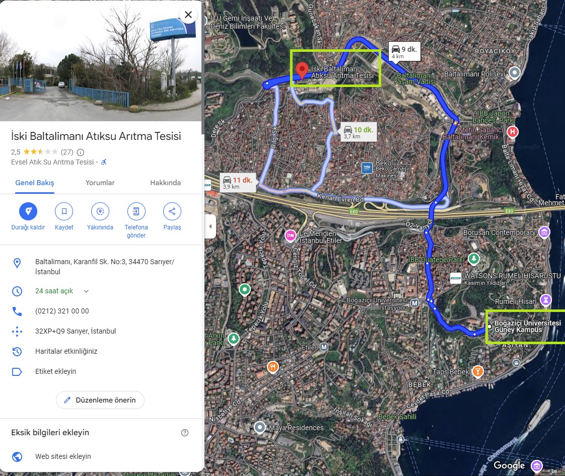 Distance between Boğaziçi University Campus and Baltalimanı WWTP