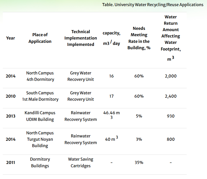 Boğaziçi University implements comprehensive wastewater treatment and water management systems to fulfil its environmental responsibilities in achieving its sustainability goals. In this context, wastewater recovery and water saving systems have been developed at various campuses of the university. The focus has been on the recovery of grey water, which constitutes a large portion of domestic wastewater, and sustainable campus practices have been implemented in this direction.