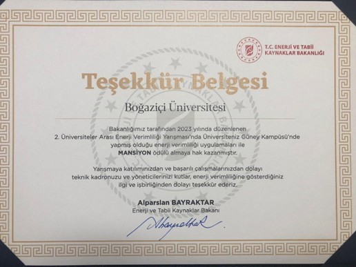 In the second Inter-University Energy Efficiency Competition (ÜNVER- 2) organised by the Ministry of Energy and Natural Resources in 2023, Boğaziçi University was awarded an honourable mention for its energy efficiency practices in the South Campus. In addition to the award, a certificate of appreciation was presented to our University by Alparslan Bayraktar, Minister of Energy and Natural Resources.