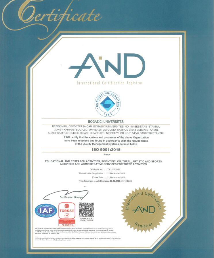 Boğaziçi University received the ISO 9001-2015 Quality Management System and ISO 50001-2018 Certificates, which the International Organization for Standardization (ISO) reviews the standards every 5 years and revises them in line with the needs.